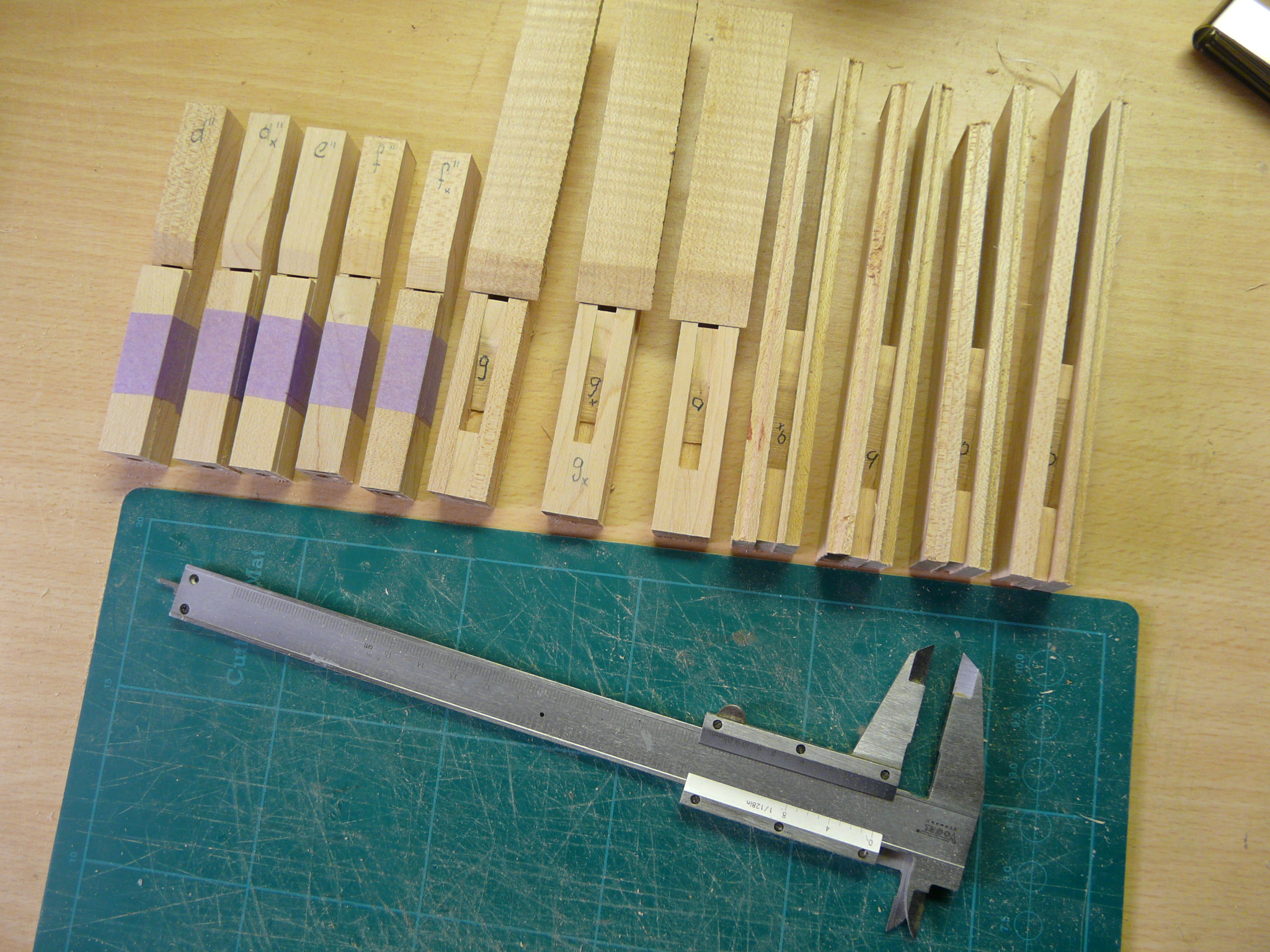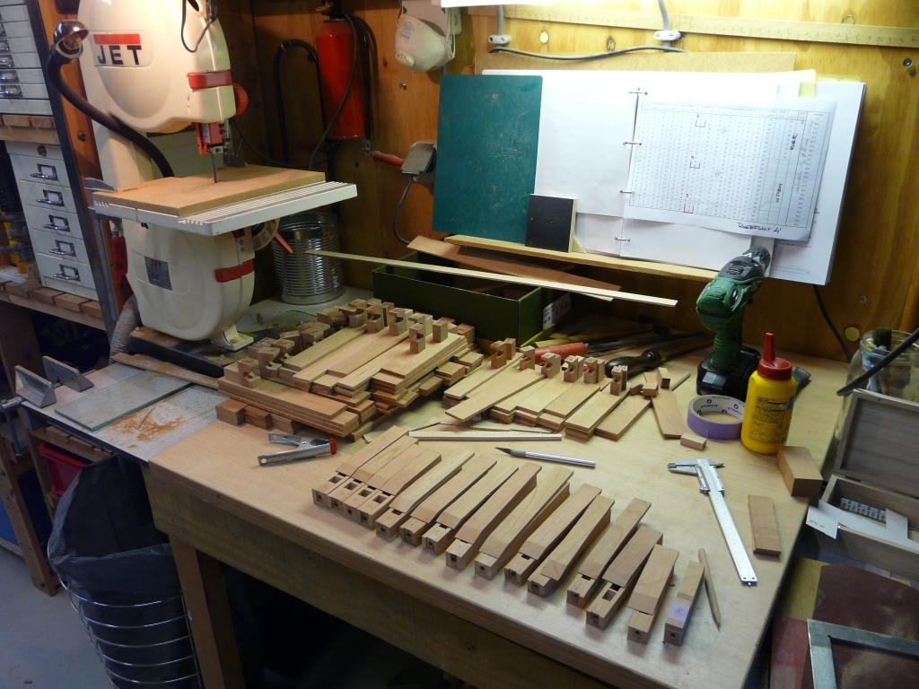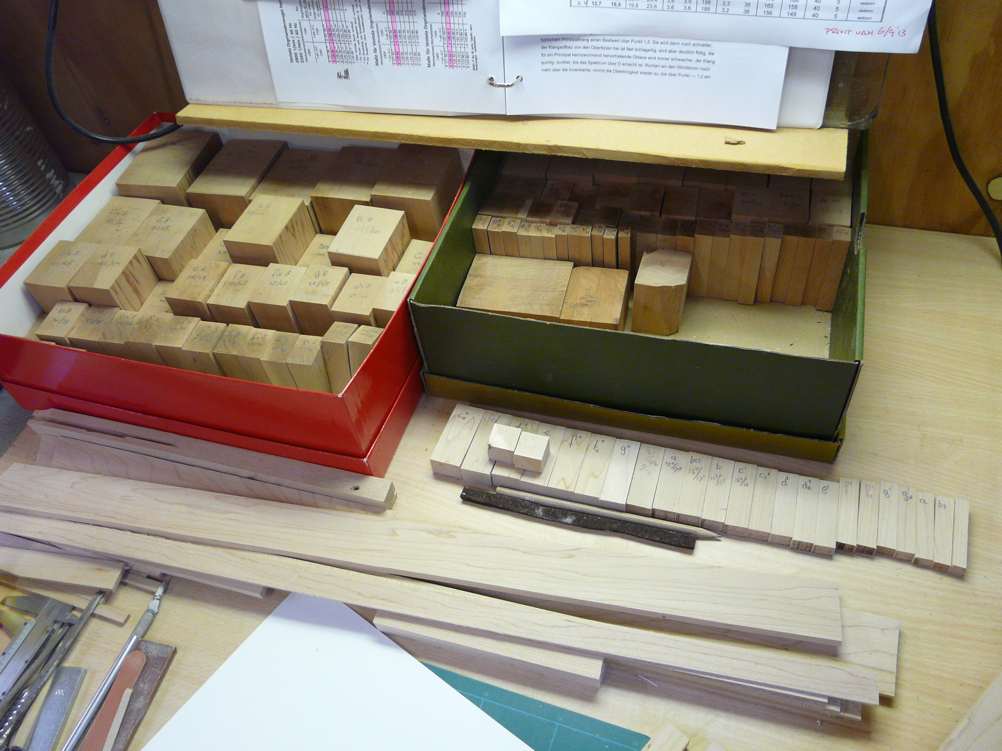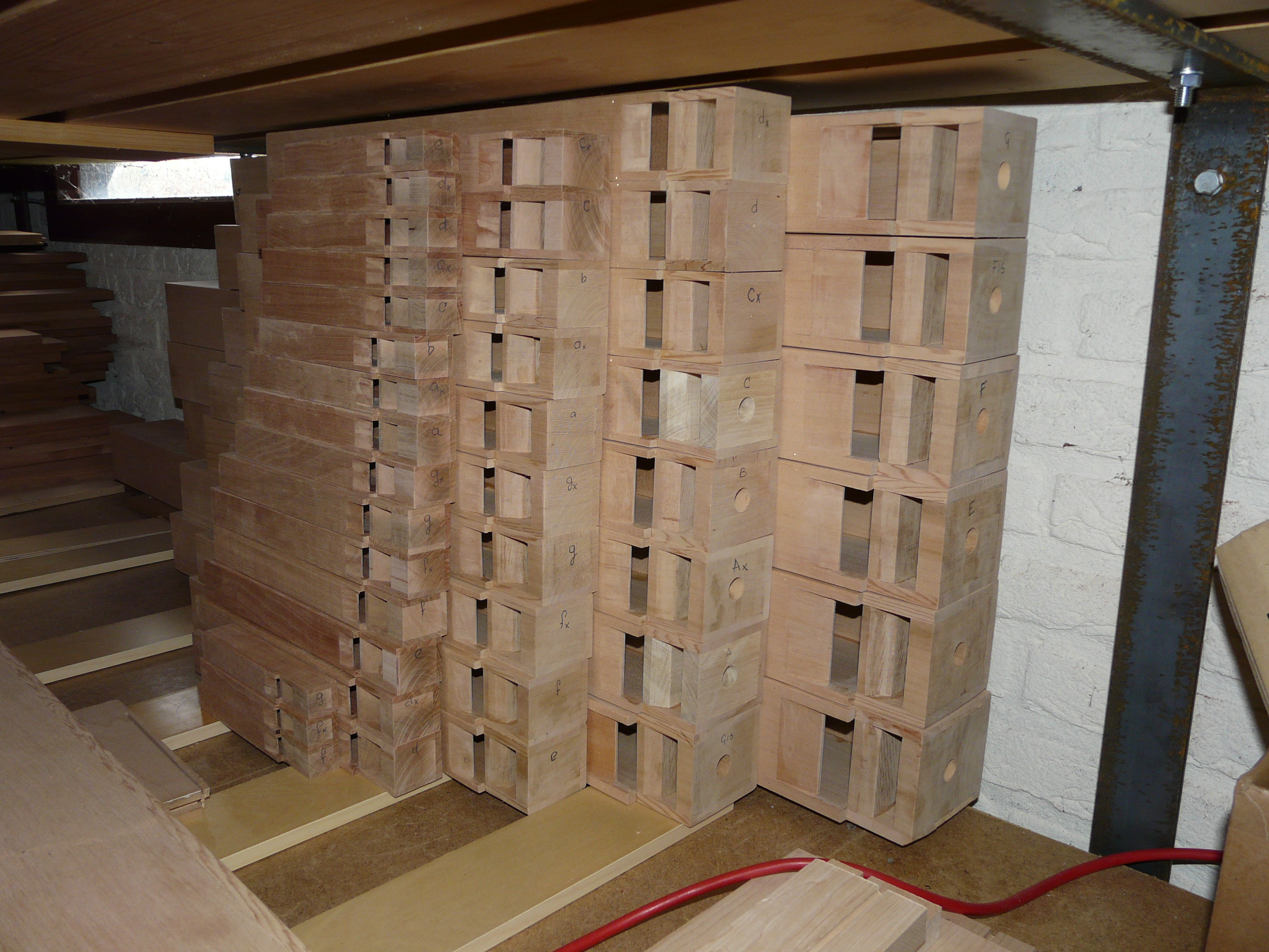 In november 2013 ben ik weer begonnen met het bouwen, weer van een kistorgel. Het moest een orgel worden met 4 stemmen: Holpijp 8', Roerfluit 4', Prestant 2' en een discant Quint 2 ⅔'. Voor de holpijp gebruikte ik in het groot en klein octaaf en voor de roerfluit in het groot octaaf Western Red Cedar, voor de overige pijpen in deze stemmen kersen (Canadian Cherry). Voor de Prestant en de Quint pas ik esdoorn toe. Het kersenhout had ik nog steeds in ruime mate in voorraad uit een 18 jaar oude parketvloer. Daar kon ik nog wel twee stemmen uit bouwen. Ook het esdoornhout komt uit een oude houten vloer. Prima hout, maar dat is nu helemaal verwerkt. Het parkethout is na het schaven ca 18 mm dik. Voor het maken van de kernen uit hetzelfde hout was het dus nodig dikkere blokken te maken door verlijmen. De kas heb ik toch weer van eiken gemaakt.