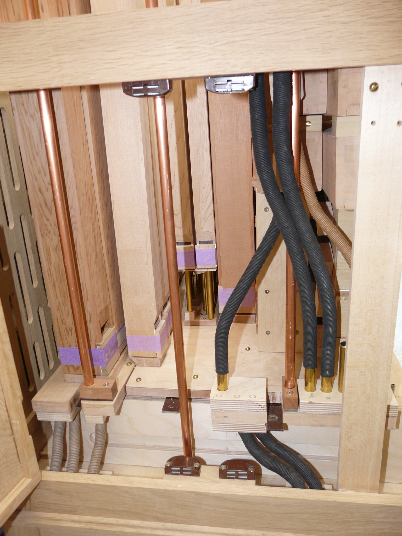 De werkwijze was weer als de voorgaande projecten: vanuit de praktijk van het bouwen stap voor stap: eerst pijpen bouwen en daarmee op tafel op grote flipovervellen de lay-out bepalen. Dat werd een nog grotere puzzle dan de eerste twee orgels, omdat ook nu het uitgangspunt was, dat het orgel makkelijk verplaatst moest kunnen worden. Het mocht dus niet te zwaar worden totaal max rond de 100 kg en per deel, max. ca 75 kg. Bovendien mocht de diepte (klavierzijde tot achterzijde) niet meer meten dan 600 mm, anders zouden de twee delen niet naast elkaar in de auto kunnen. De breedte (= kant van het klavier) schat ik op ca 1100 mm. Na het bouwen van de pijpen en het bepalen van de lay-out ben ik verder gegaan met de windlade. Die is eind augustus '14 gereed gekomen). Vervolgens het klavier, de windvoorziening, de tractuur, het regeerwerk, de kast e.d. Ik ben daar een langere tijd mee bezig geweest, dan ik had voorzien. Het is juni 2016 geworden, toen het orgel bespeelbaar was.